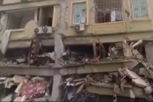 このマンションは11階建てで、下層階が押しつぶされた状況。救助隊によると、数百人が閉じ込められている可能性があるという。